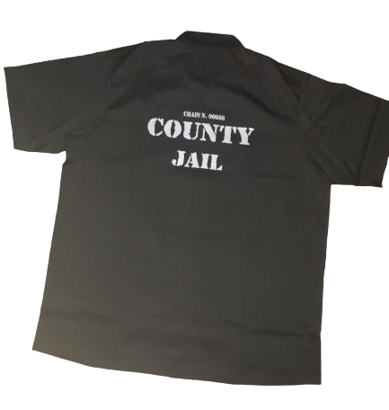 Zwart workshirt met opdruk aan voor- en achterkant.