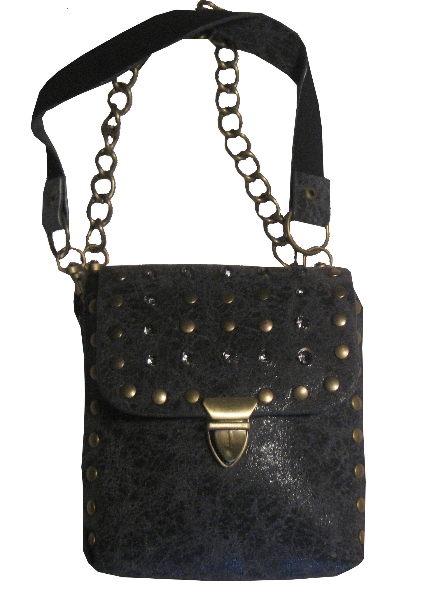Met koperkleurige studs en heldere strass
